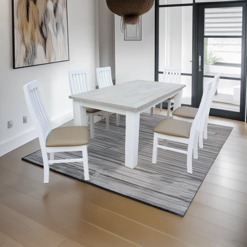 Introducing our exquisite 7-piece dining set, meticulously crafted from acacia wood and elegantly finished in a captivating blend of white with ashwood tops. This stunning ensemble brings together rustic charm and modern sophistication, making it the perfect addition to any dining space.